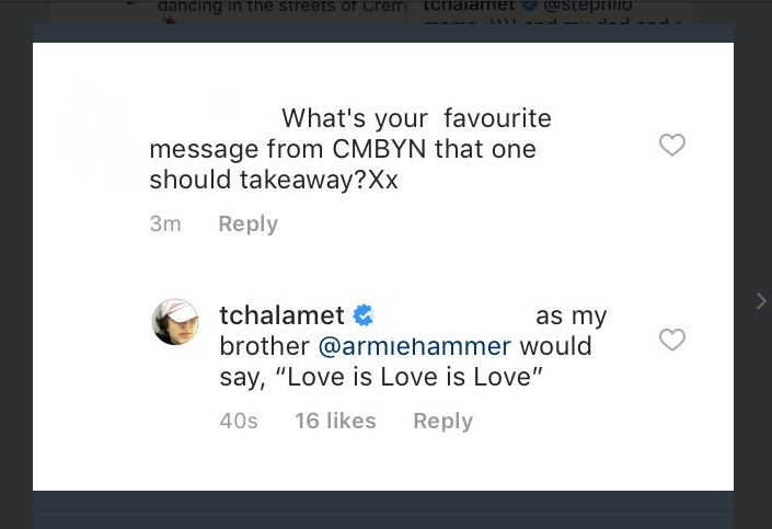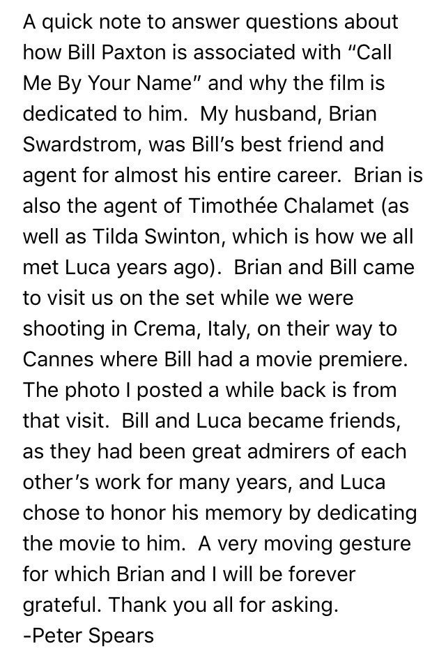 ’Many of you have asked about Bill Paxton’s connection to Call Me By Your Name. Please see my response below. Thank you.’