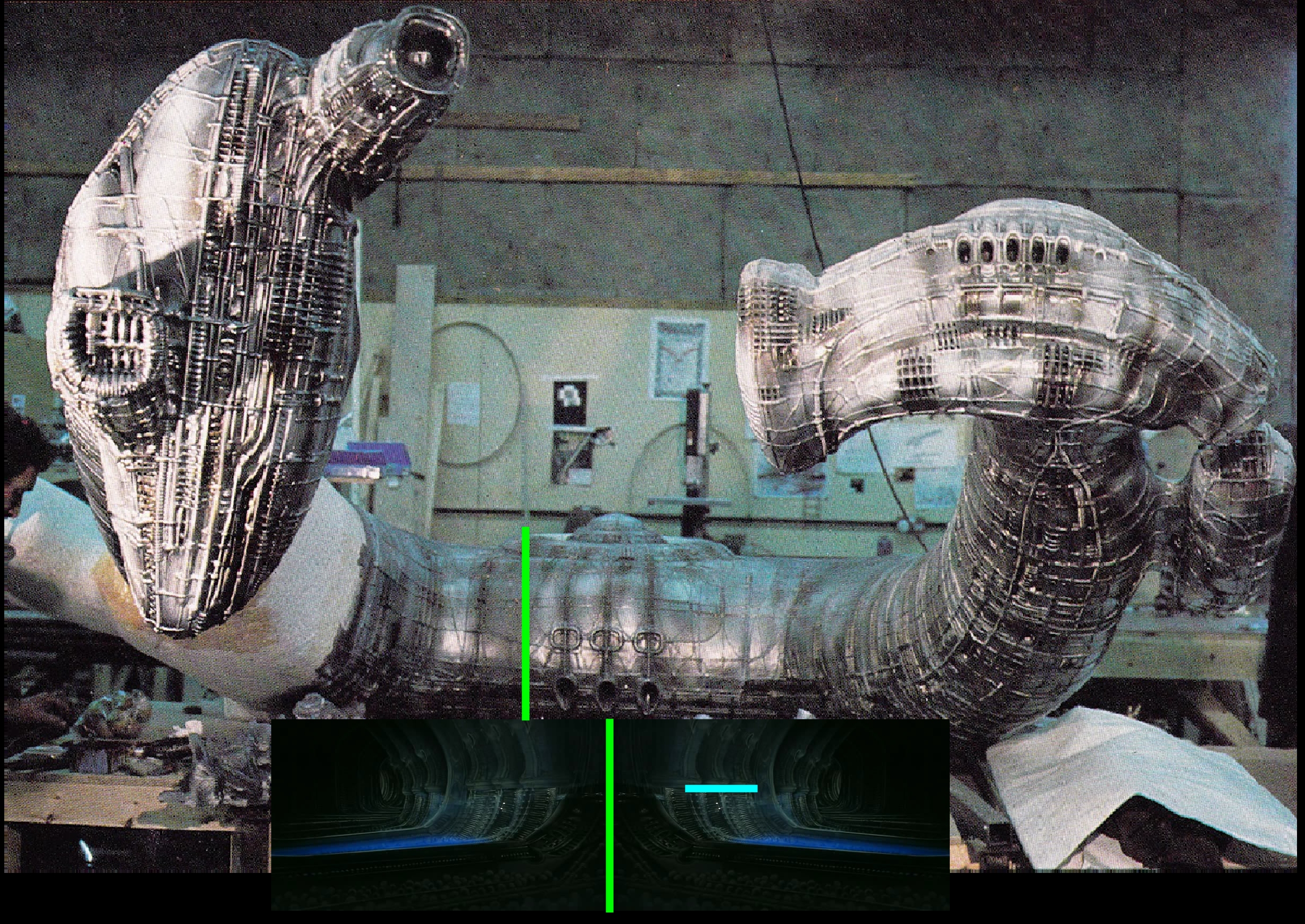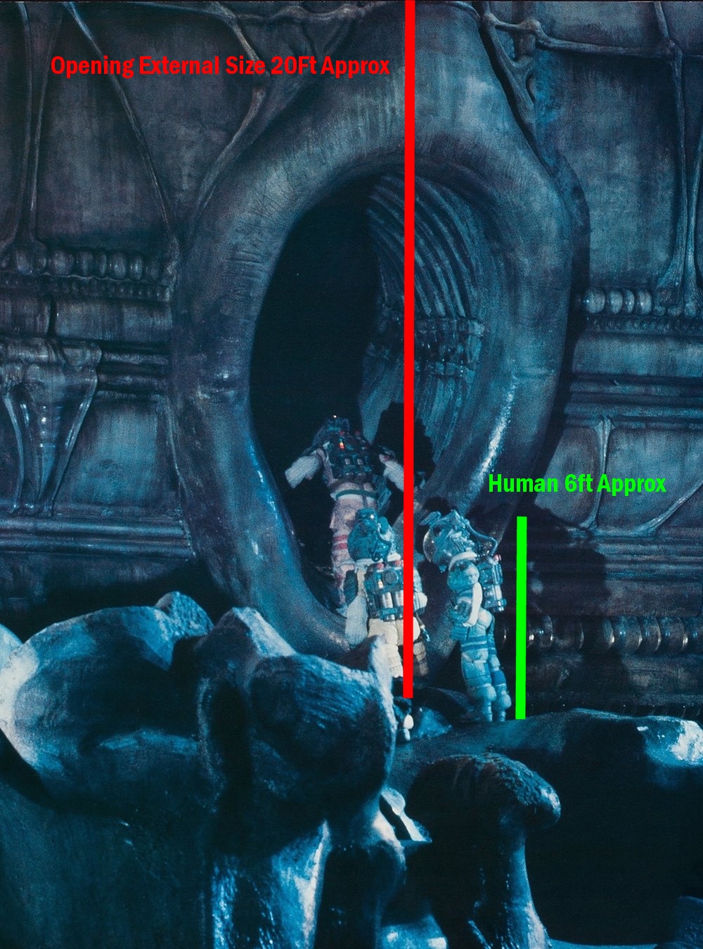 Which shows the Opening External Size is about 3.5X Height of the Space Suited Humans, and so a 20ft Estimate is Approximately the External (Vulva) size but it could be between 20-22ft mark, but i can now use this to roughly scale the descending Kane in the Egg Chamber Image to the Openings on the Derelict Prop where i will allow for Kane Height to be between 3-3.5X Less.