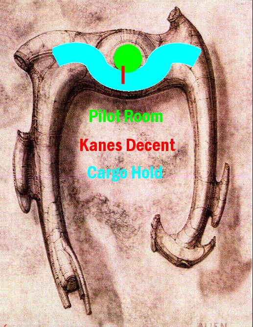 IF the Cargo Hold is part of the Ship, i feel its likely set out like this, where maybe the BLUE Cargo Hold would Curve more to fit the U Shape of the Derelict, i think this could show that IF the Derelict was TWICE the size or HEIGHT then the Egg Chamber would FIT.... even if it was 50% Larger (Derelict) i think it would FIT, but looking at how they Entered the Derelict and the Pilot Chamber we can assume the Cargo Hold would start about Level with the Vaginal Openings, or at very Most the 3 Markings that are above them and thus would not FIT how it does in the MOVIE.