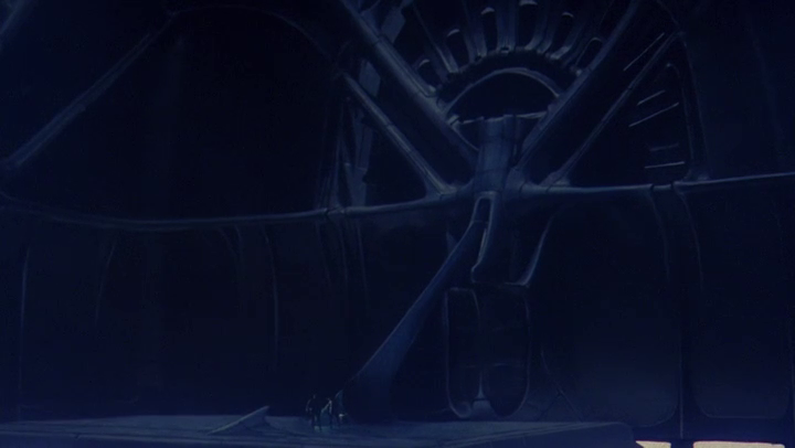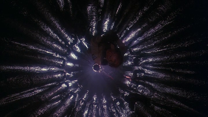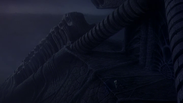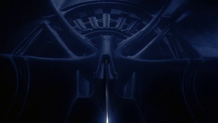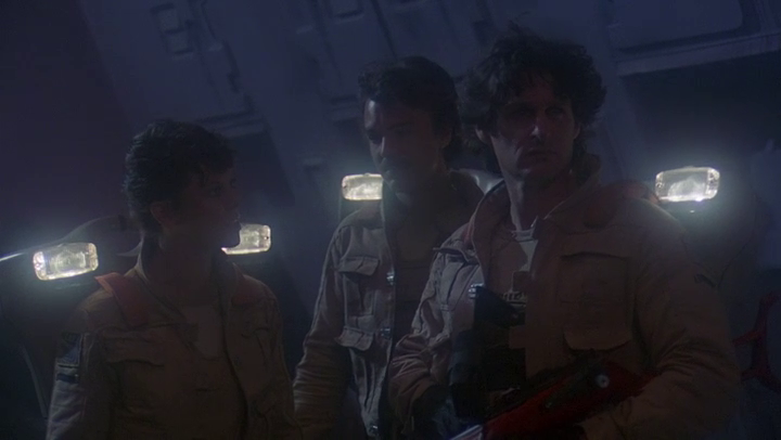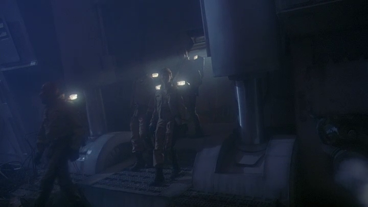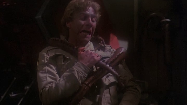 Making their way across the landscape of the planet, they eventually reach the other vessel. Entering, they find evidence of a massacre that took place. The rescue teams split into two and explore the craft. They find further evidence of something catastrophic having happened and, after disposing of the rest, take one victim back for analysis. Cos, the highly-strung youngest member of the team, despite being reassured by his seniors, becomes increasingly terrified by being on the ship and, a short time later, he is killed by a grotesque creature.