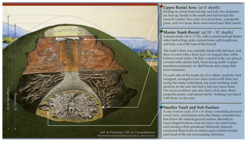 1. The Criel Mound was excavated in 1883–84 under the auspices of the US Bureau of Ethnology and the supervision of Col. P.W. Norris. The excavation was performed by Professor Cyrus Thomas of the Smithsonian Institution. Inside the mound, Professor Thomas found thirteen skeletons: two near the top of the mound, and eleven at the base. The skeletons at the base consisted of a single very large but badly decayed skeleton at the center, a "once most powerful man" which according to A.R. Sines who assisted Col. Norris in the excavation, measured "Six feet, 8 3–4 inches" (205 cm) from head to heel with broad shoulders, massive teeth and a very thick low and flat skull encased in a large copper headband. This skeleton was surrounded by ten other skeletons arranged in a spoke-like pattern, with their feet pointing toward the central skeleton. The skeletons at the base had been wrapped in elm bark and were lying on a floor of white ash and bark. Several artifacts were found buried with the skeletons, including arrowheads, lanceheads, and shell and pottery fragments. The central skeleton was accompanied by a fish-dart, a lance-head, and a sheet of hammered native copper near the head. Holes found at the base of the mound suggest that the bodies at the base had been enclosed in a wooden vault. (https://en.m.wikipedia.org/wiki/Criel_Mound)