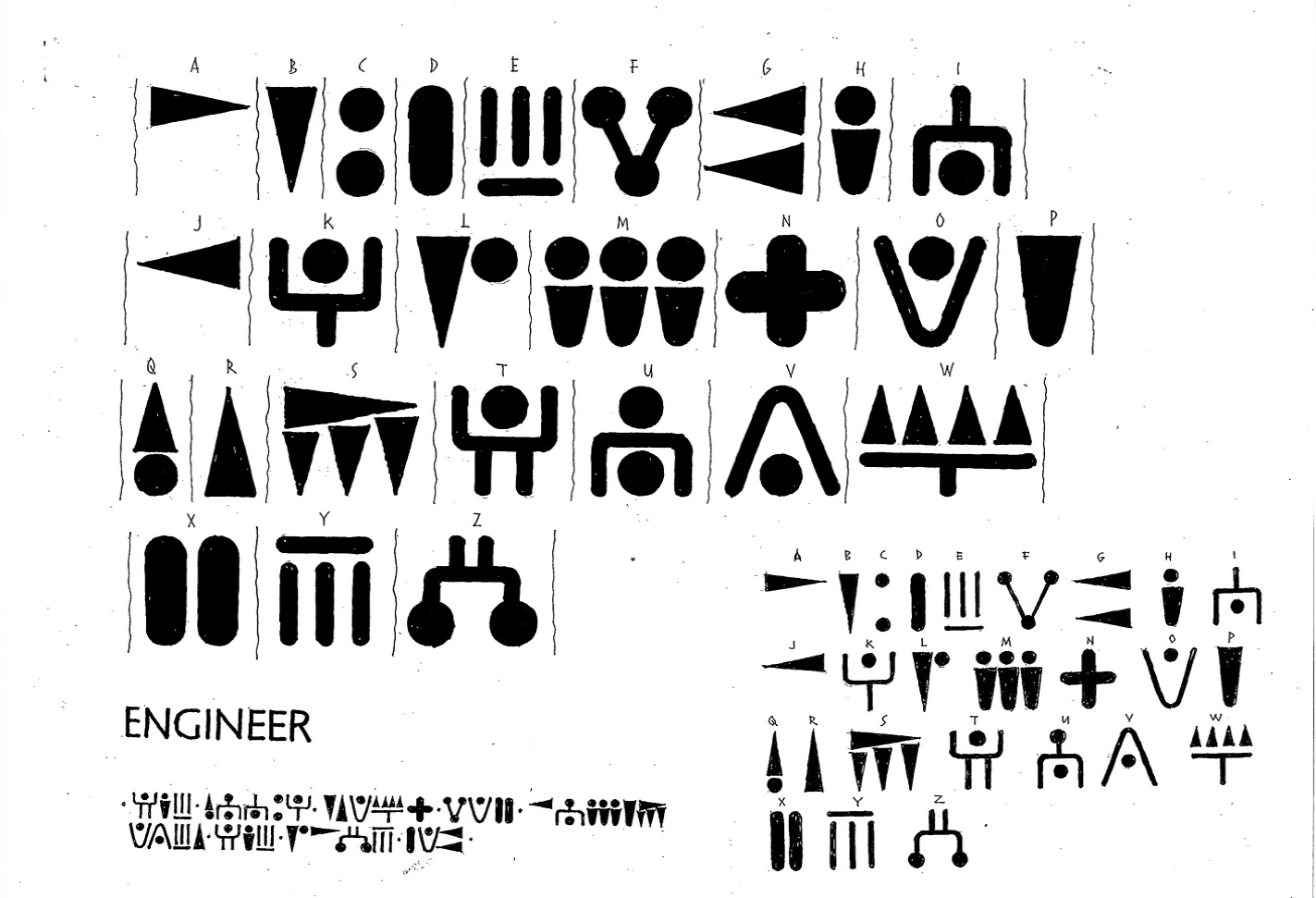 just like the rest of the prequels this language thing is a bit all over the place. if this alphabet is accurate, is it meant to be a straight into English translation or is it another language (greek etc) but in English and so we have to translate it again. yet which language? did the engineers influence the greek language? did they come and see how far the greeks had come and thought that they were progressing just fine so they didn't have much influence at all? if this is the case then it may even be a much older language but surely Fox wouldn't make it that difficult for fans to translate.