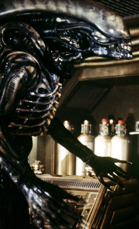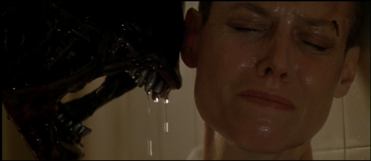 The xenomorph regurgitating fluid and the fluid raining off them seem to coalesce into the biomechanical aesthetic formations that we saw in Alien (Dallas above) and Aliens around the queen's hive under the processor that the Colonial Marines encountered (enhanced image below).