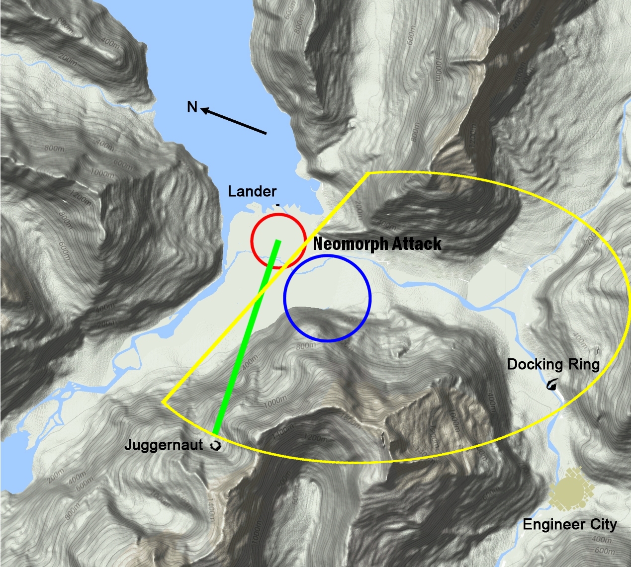 The RED Circle has to be the Area of the Neomorph Attacks they have to fall in or around this area. The GREEN Line would be the Distance in a Straight Line from the Crashed Juggernaught to the Lander.