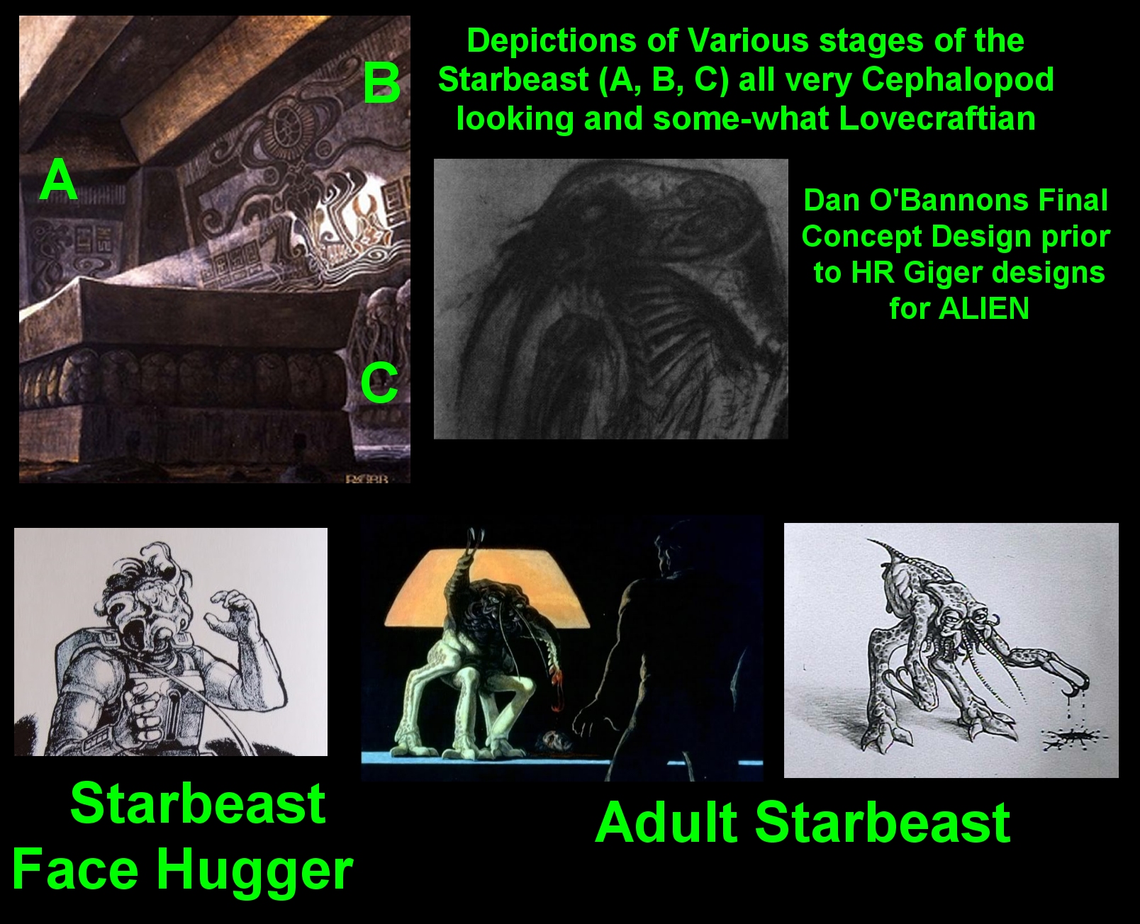 The other difference is the Aesthetic of the Starbeast which went through many designs... which however the draft had described as looking like a Octopus at Face Huger Stage, concept work also matched this, the Chest Buster Stage was described like a Worm but shown in the Mural to be again a Cephalopod looking Organism and then the Adult stage was described as having Arms/Legs a Head but also having Tentacles and so looked Quite different to our Xenomorph, i am not sure some of the Concept/Idea work for Starbeast would be very fitting as some designs looked odd.
