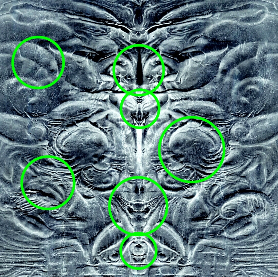 As i can make out a number of Faces/Heads of Organisms, which include Birdlike, BabyHead Alien like, and even like Wolf-like.