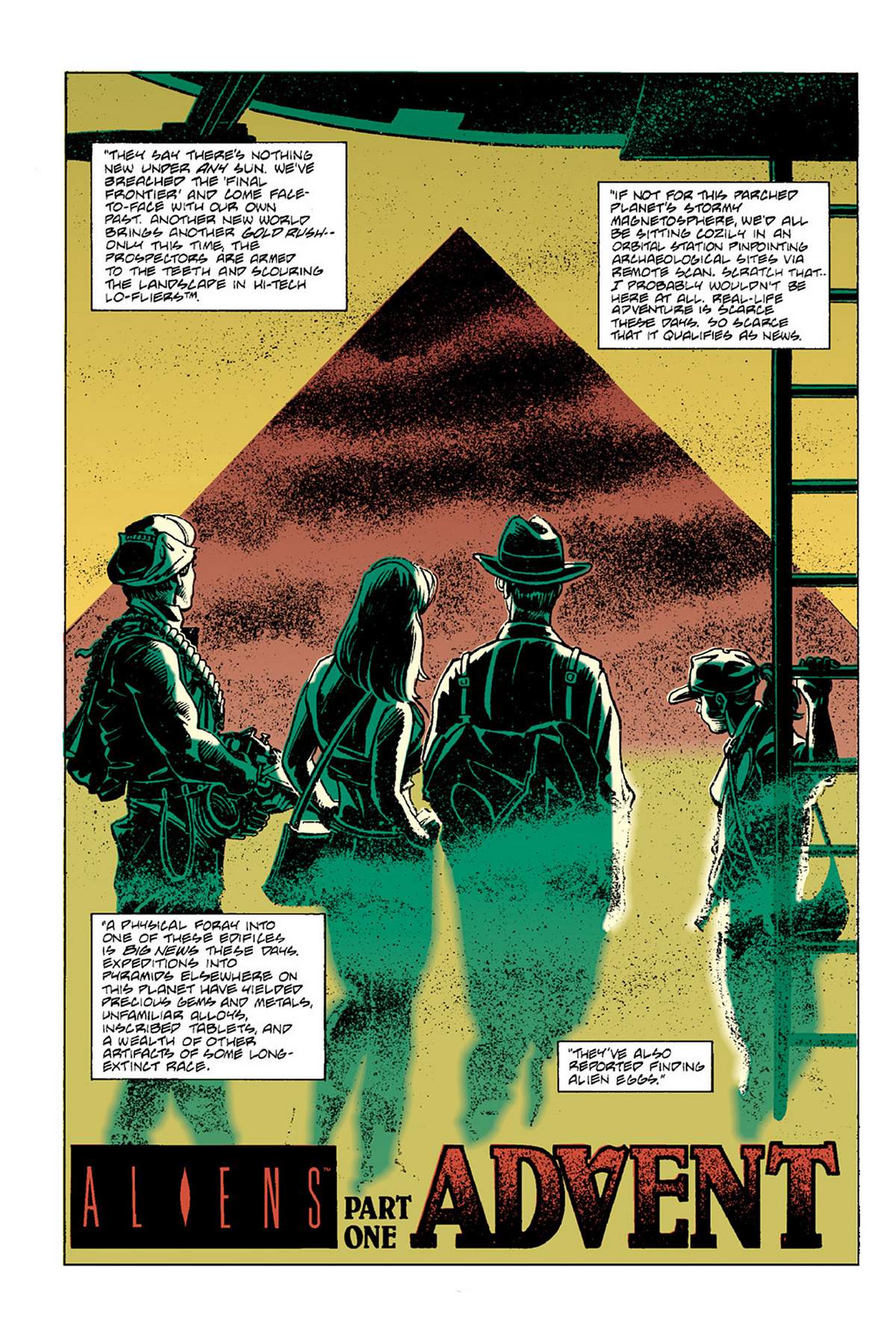 The Pyramid is a recurring theme in the scripts, films, and comics. In Aliens: Advent Part 1 (2013), the team sets down for a potential archeological score.
