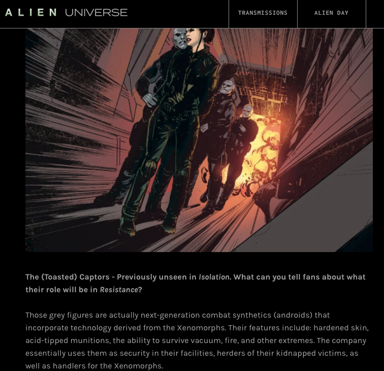 "Those grey figures are actually next-generation combat synthetics (androids) that incorporate technology derived from the Xenomorphs. Their features include: hardened skin, acid-tipped munitions, the ability to survive vacuum, fire, and other extremes. The company essentially uses them as security in their facilities, herders of their kidnapped victims, as well as handlers for the Xenomorphs."