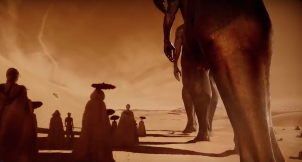 We see a World that has more Sand/Dunes and Sand Storms (Sand Tornado's, like we saw Silica ones in Prometheus). The Humans are dressed in WHITE and we see some Giant Bald Humanoids as if made of this Substance, its implied these Species have a Good Relationship with each other. Where are they BOTH going?