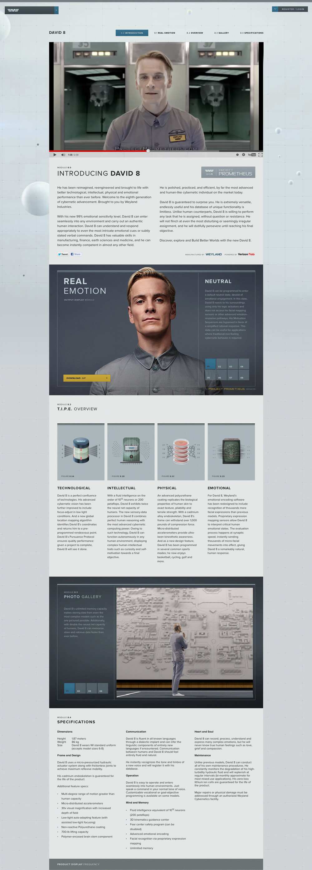 I created the narration from the David 8 Technological Intellectual Physical Emotional (T.I.P.E.) text Specs found on weylandindustries.com, below.