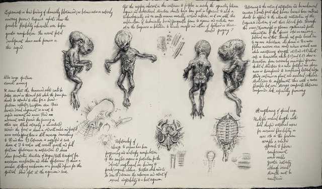 Results are encouraging. Although research into fibrous substructural bases are proceeding, greater effectiveness in soft porous structures and rapid expansion into citinous carapal dermal layers need to be prioritised. Feeding beyond birth is not guaranteed considering the different environmental possibilities of the organism is to be most effective. With that in mind, growth over feeding adaptability seems appropriate. Bone density and strength: While the Engineers have definitely taken steps to evolve their genetic structure and durability they curiously maintain a strange deference to the sanctity of their original pre-technological state. Strange for a civilisation who has moved through industrial/technical considerations shown in their early structures to the evolution inherent in their eventual aesthetic as a spacefaring culture. One can only assume they ironically treat themselves as they do their cities as cultural and developmentally historical documents to be treated with reverence. Yet the myopia inherent in this continues to perplex, as surely the symmetry between organic and archtectural [sic] structure should have been just as apparent to such a technologically and one would assume morally evolved culture; as it was with the sublimation of technologically biased/pragmatic forms to organic and aesthetic ones. Are the Engineers as beholden to linear concepts and notions of Godhood as their stunted progeny? Returning to the notion of integration and biomechanical concerns, I would posit that lessons learned here could and should be applied to the ultimate maturation of the Engineers’ direction if not their literal fate. Through the virus/Xenomorph as glorious synthesis and poetic culmination of the species. And an amusing biblical one at that. Though not quite linear due to my own inheritance. As shown in B. a more fiblous [fibrous] marrow area would reduce overall mass while maintaining strength A.1.) and A.2.) illustrate in transverse, while C.1.) and C.2.) show a transition from curiously unmodified forearm skeletal structure to a more fortified one where mass is transferred to reinforcing lateral ridges. Study continues on plant and mineral cellular structures to supplement this with a more flexible but even stronger composite chitinous compounds look especially promising. Experiments in head binding of chemically lobotomised (see botanic notes re natively occurring poisons) Engineer infants show the possible flexibility achievable even before genetic manipulation. The current foetal development shows much promise in this regard. Wide range spectrum cranial sensing. It seems that the humanoid orbits could be better served as thermal pits while the brain pan should be extended to allow for a broad-spectrum reflector/reception area. Bias towards dorsal alignment so as not to impede movement and access. Head movement would provide the panning in other axes. While intensity is concentrated towards the front as shown in A) with ocular and frontal areas overlapping, there is still coverage diminishing to B) and then C). Extension is suggested at rear shown at d) to evolve with overall growth and full spectrum effectiveness on maturation. E) shows shows [sic] peristaltic structure of tongue/teeth transport for maximum acceleration and strike effectiveness. F) shows a similar stabbing mechanism as a possible defence for the spectral blind spot at the organism’s rear. Relationship of ribcage to organs has been progressing and excitingly manipulation of the simpler organs as protection for the delicate oesophageal sac leading to penile/vaginal cloaca. Further work needs to be done to determine the relevance and extent of sexual adaptability to a host organism. Strengthening of spinal cage. Multiple vertical lengths with ball shaped vertebral nexus for increased flexibility in axes. As in the forearm example a related approach to fibrous reinforcement would enable greater dexterity, although dorsal strength must be maintained."