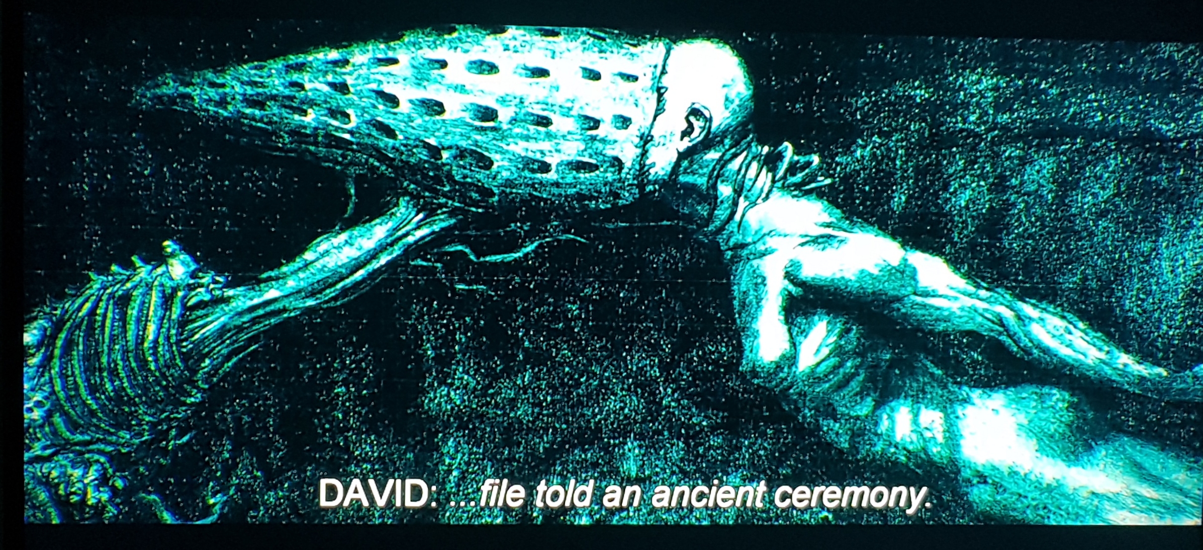 Later on in the movie, we see what the pathogen can achieve when David persuades Holloway to have a drink spiced with the pathogen. Through intercourse, Shaw is also infected and gives birth to a large “facehugger” (the trilobite) which in turn infects a still living engineer who “gives birth” to a xenomorph creature (the deacon).