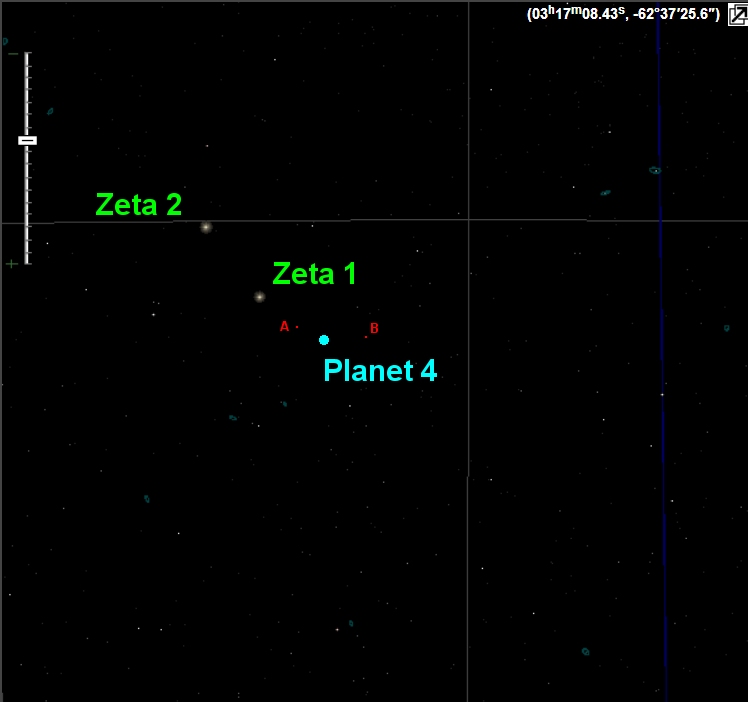 Marked where Zeta 1 and Zeta 2 are, the BLUE Dot is a location that Matches where David sent the Advent Message from, which is RA 3h 17m 8.0s Dec -62° 37' but there are NO Stars at this Location... The closest TWO which i have marked in RED as A and B are.