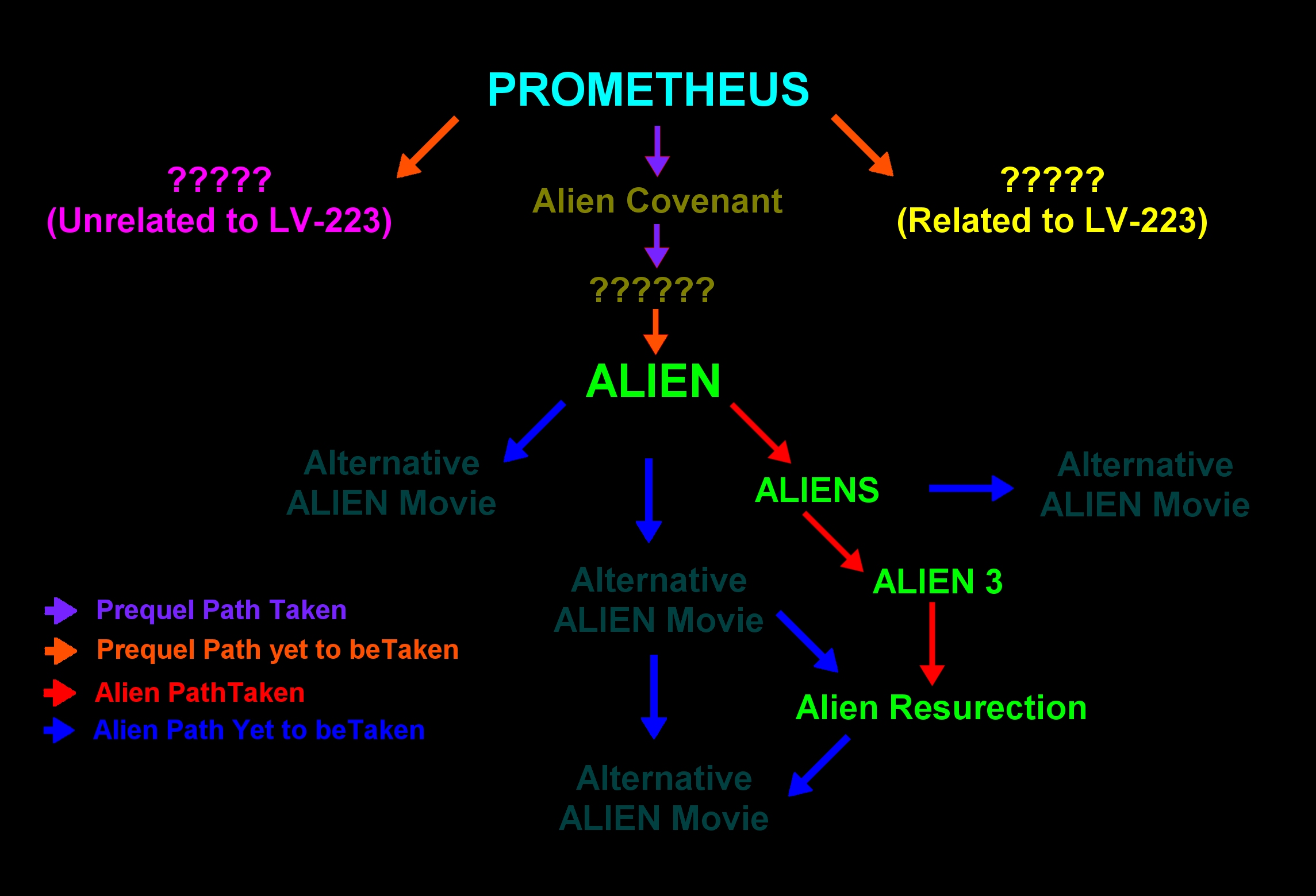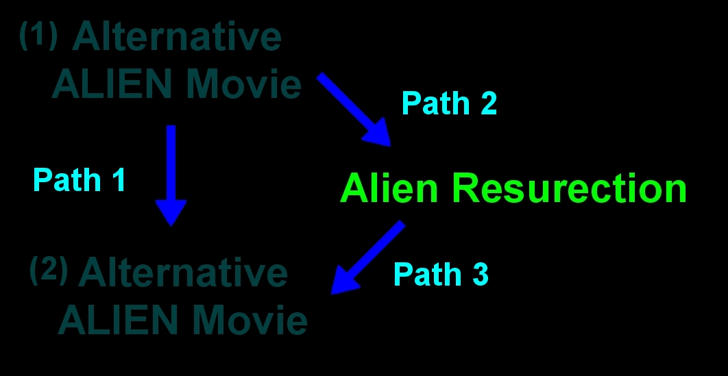 Alternatively the other route to Alternative Movie (2) (Path 3) would be a Sequel or Parallel Story to Alien Resurrection, like what happened to Ripley 7 Queen could this had been Shipped to another place for Study? or Alternatively is there something to be Salvaged from the Auriga? And so would not connect to Alternative Movie (1) those Arrows are only to show Potential Routes