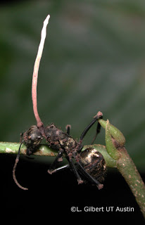 When these fungi attack their host, they replace its tissue and sprout long, slender stems that grow outside the host’s body.
