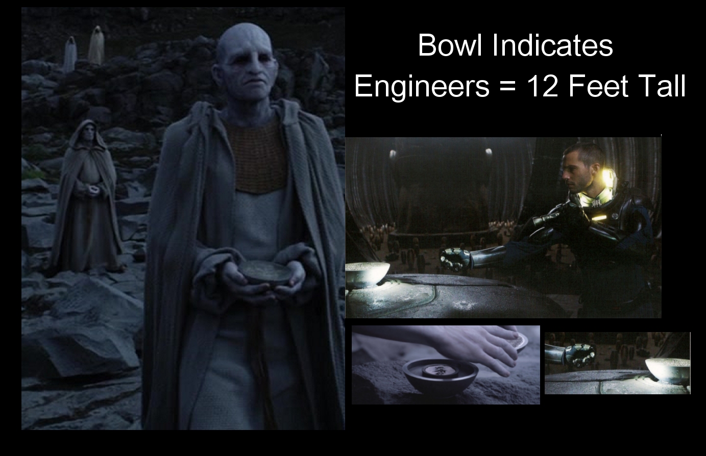 The Movie is Ambiguous but the Sacrificial Cup/Bowl was in the Trailer, this Cub/Bowl was LARGE compared to Holloway and if we assume this is the Same as the Sacrificial Engineers Cup/Bowl then compare Holloway to the Cup/Bowl and the Engineers would mean the Engineer would be about 11-12ft Tall. (which was the Intention in the Drafts).