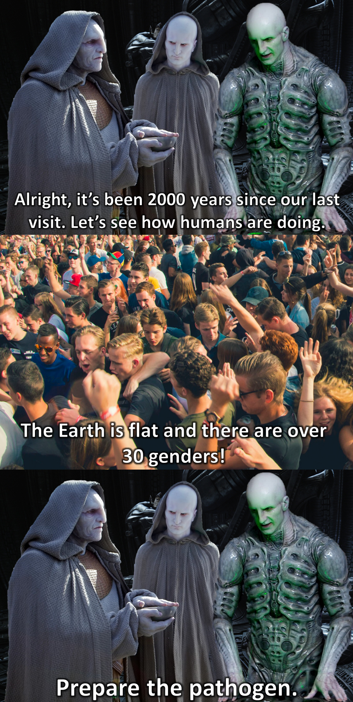 He liked to get us to think that over time the WAYS that Mankind had behaved had started to become a Concern, if we LITERALLY was to look at it from GOD's POV and you saw the Majority of the Population Now as far as WHAT would offend the Biblical God, and as FAR as the % who Worship him to the LETTER... Then that GOD would certainly be like PREPARE THE BLACK GOO!
