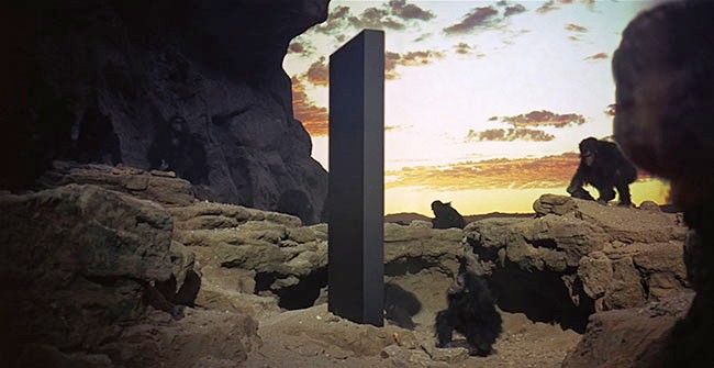 In 2001, the film begins about 4 million years before our time in the African savannah. A monolith descends to earth and changes evolution, turning apes into humans (by giving them the capacity of abstract thinking). Later on in the movie (in the future), we are transported to the moon where a human colony has found a monolith buried in the dust. When the monolith is exposed to sunlight, a signal is sent through the planetary system - to Jupiter.