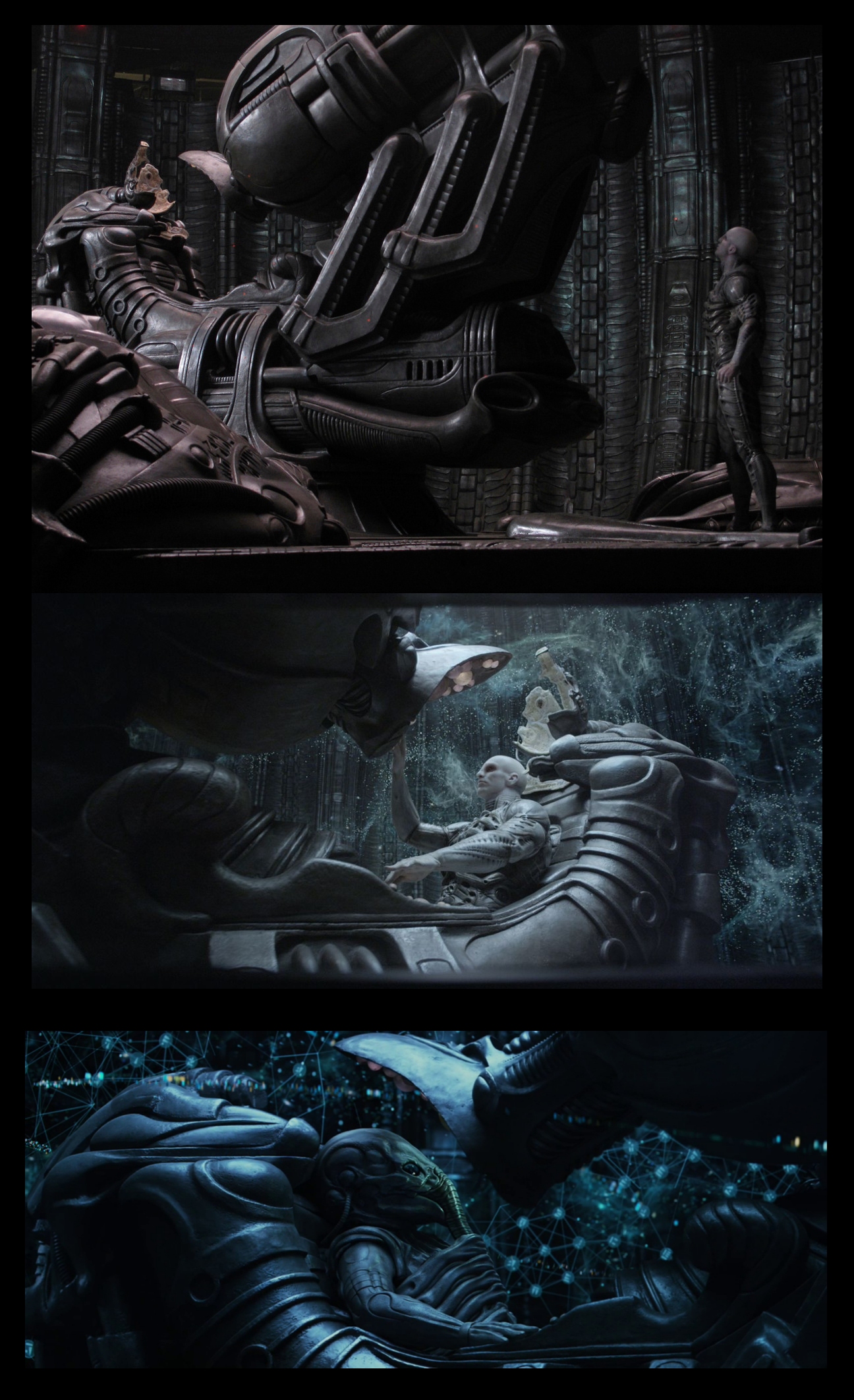 These Close Ups show the Under-Suit seems to Merge seamlessly with the Engineer so it would be hard to see where the Suit Begins, it could even be Permanently Fused with the Engineer and so WHEN the Engineer gets into the Chair and the Space Jockey Suit then Attaches to him then IF the Engineer Dies and you have a HOLE in the Outer suit, if you looked inside and saw a Engineer in the Bio-Mechanical Suit beneath you would NOT be able to work out what is a Suit and what is NOT.