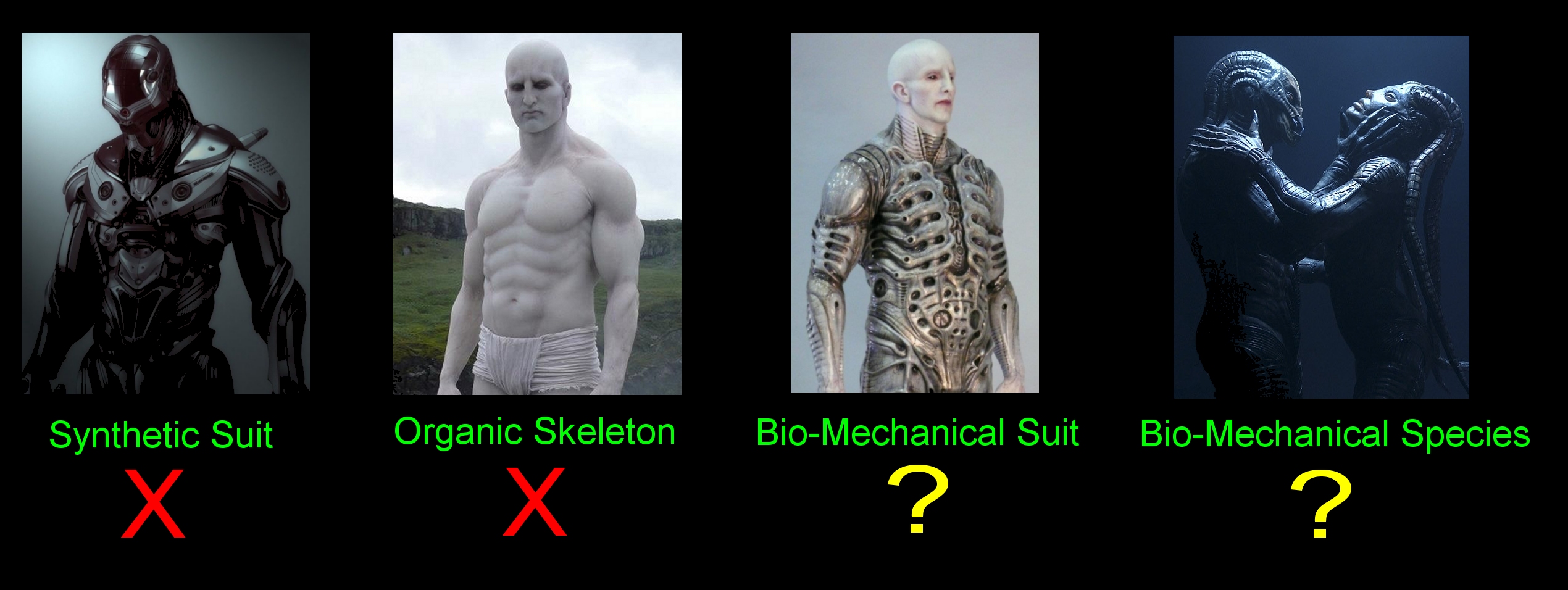 I think its best i USE the Old Analogy i used on here in 2012 which is the Cactus...  The Suits could be somewhat Organic, like a Plant (HR Giger said the Derelict was likely Grown like a Plant).
