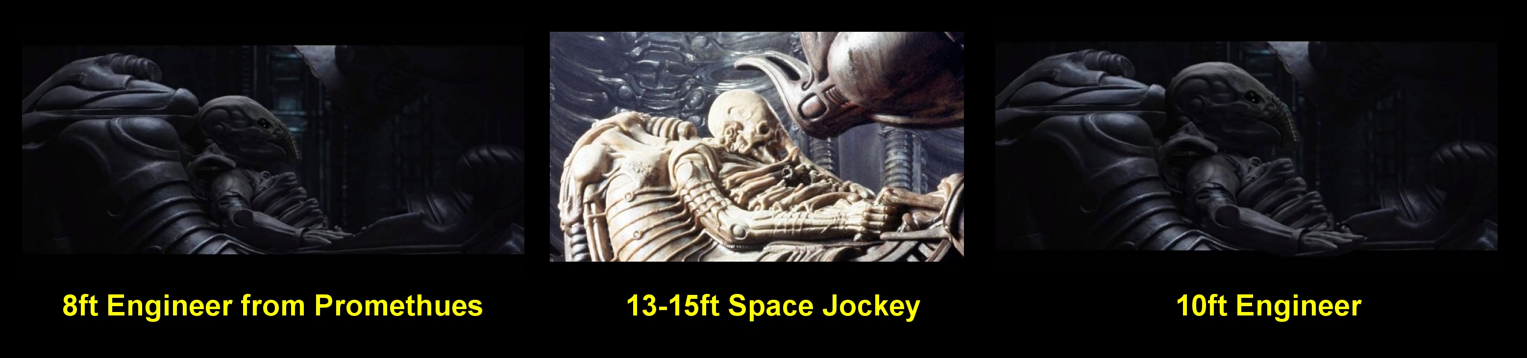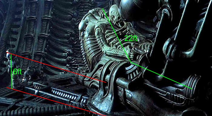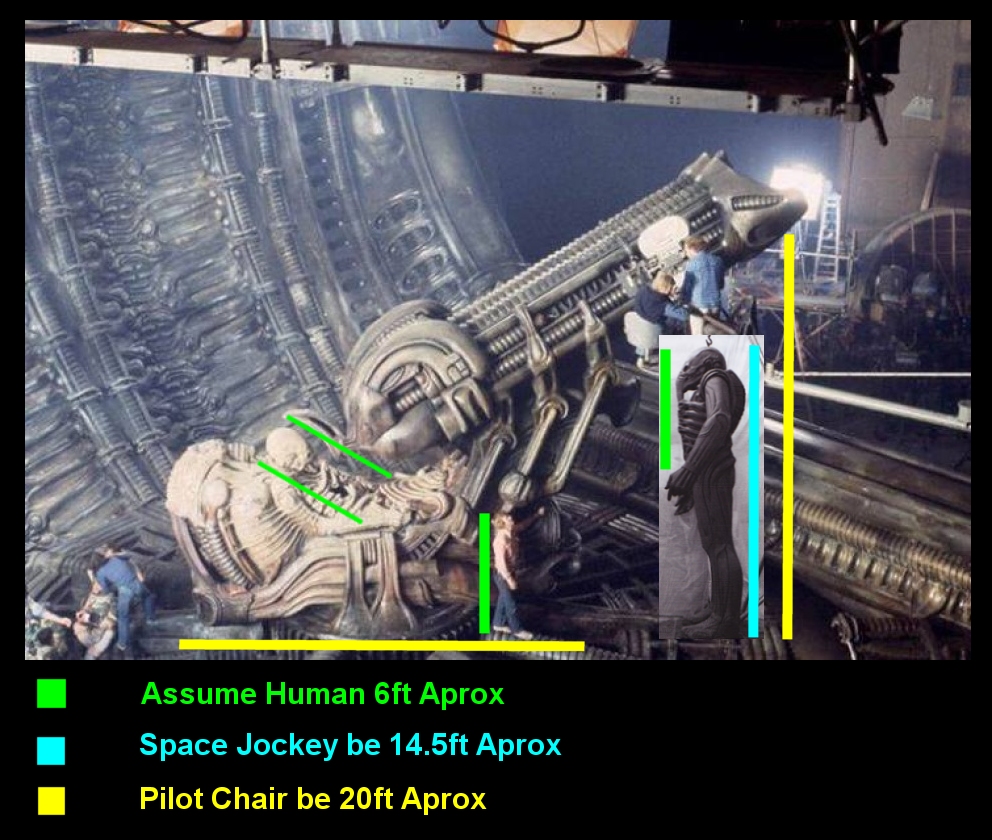 The other TWO have Production Members UP-CLOSE actually like Face to Face near enough with the Space Jockey and NOT the Chair... using these i Estimate the Space Jockey to be 13-14ft.