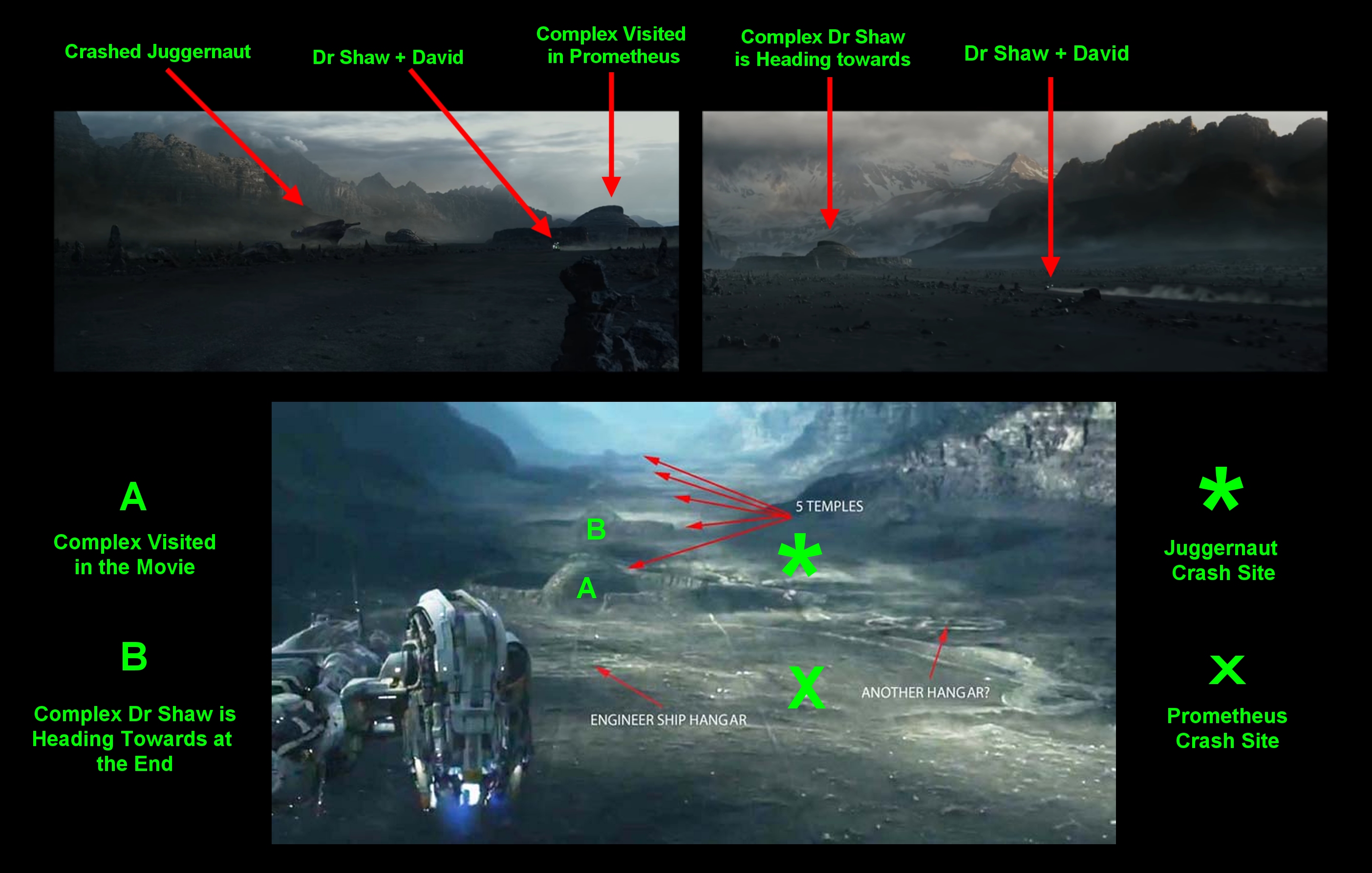 When we hear Dr Shaw and her SOS, the Buggy is heading from the Temple Complex they Visited in Prometheus, then we see them Head towards the Next One... the Prometheus Wreckage is on the other Side of the First Complex, the Crashed Juggernaut is on the Opposite side of the Complex...