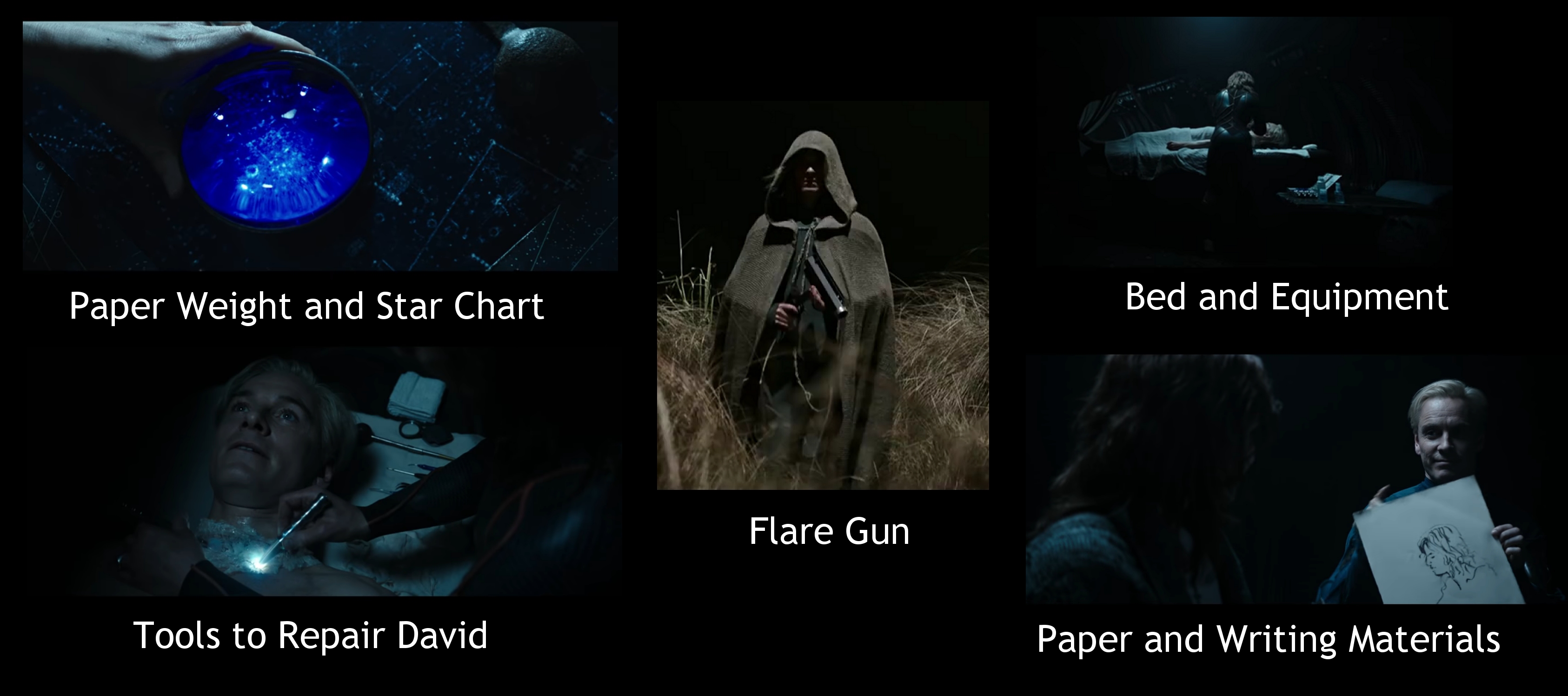Some Stuff could maybe had been Collected from the other Complex or on the Juggernaut.... these could include the Jar that Dr Shaw drinks from, the Robe she is Wearing, and maybe a Supply of Nutrition (Drink) then the Drink could have been from the Life-Boat.