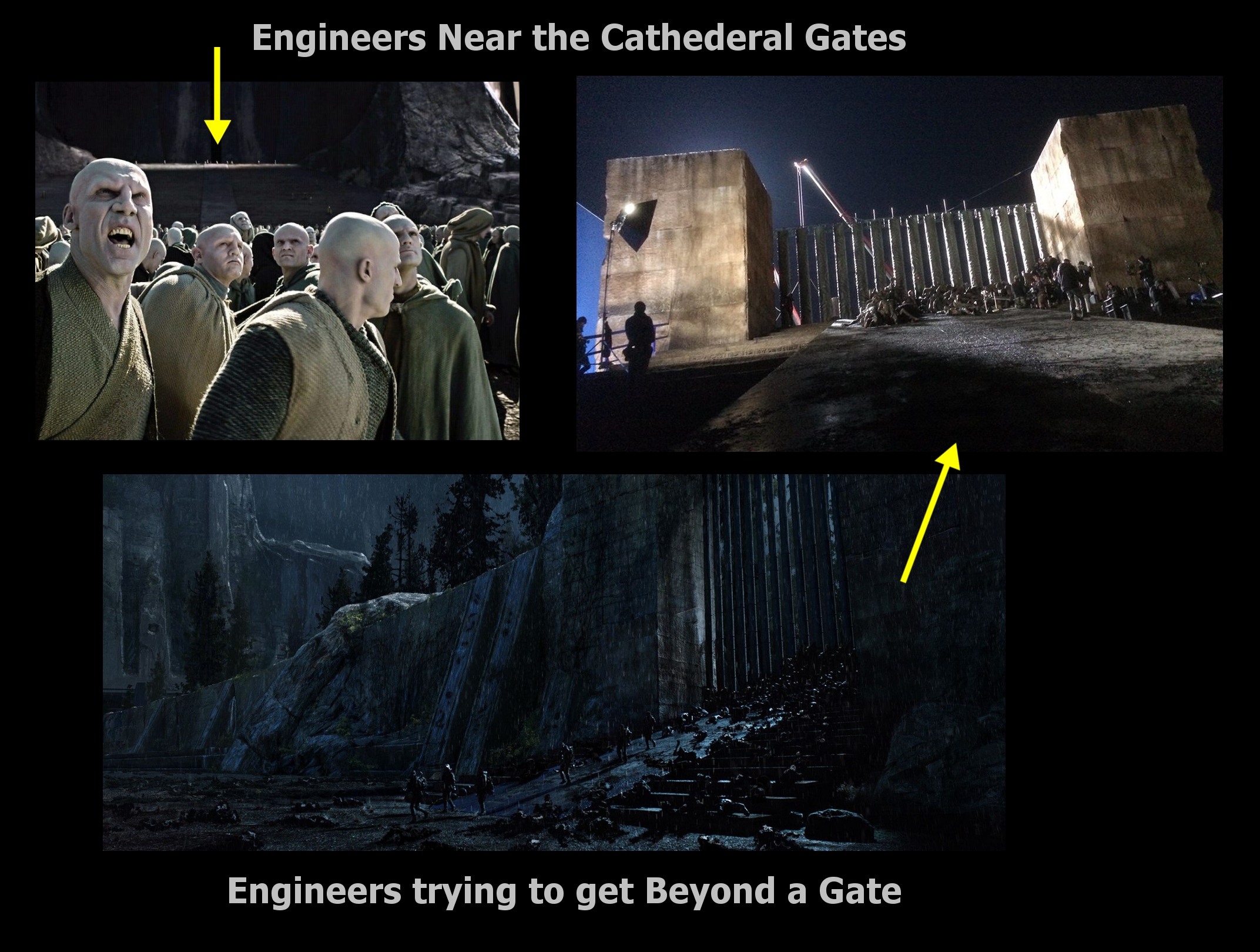 There are a FEW shots in the Movie that appear to show the Engineers trying to get past a Barrier Gate that is SHUT, there are also a Number of Engineers right outside the Cathedral as the Bombardment Started.