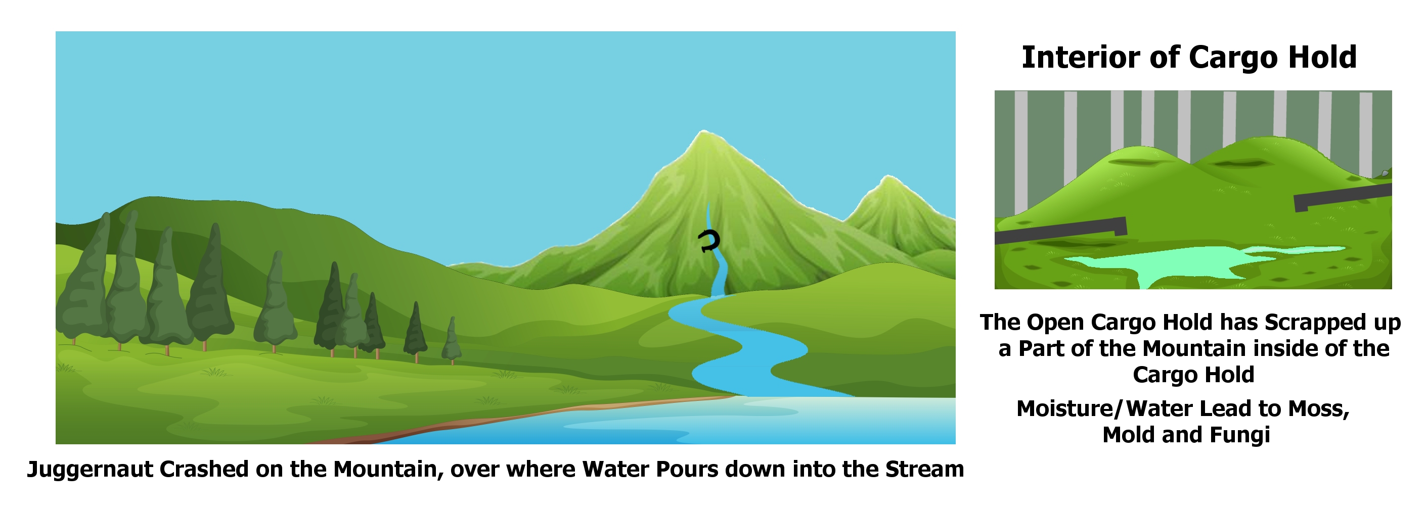 Eventually Mold, Moss and Fungi Grow inside the Cargo Hold, and a Leaked Urn/Ampoule would have Infected the Water Supply and Evolved the Fungi into Neomorph Spores, the Pathogen then also running down the Stream and Evolving other Areas of Fungi to more Spores.