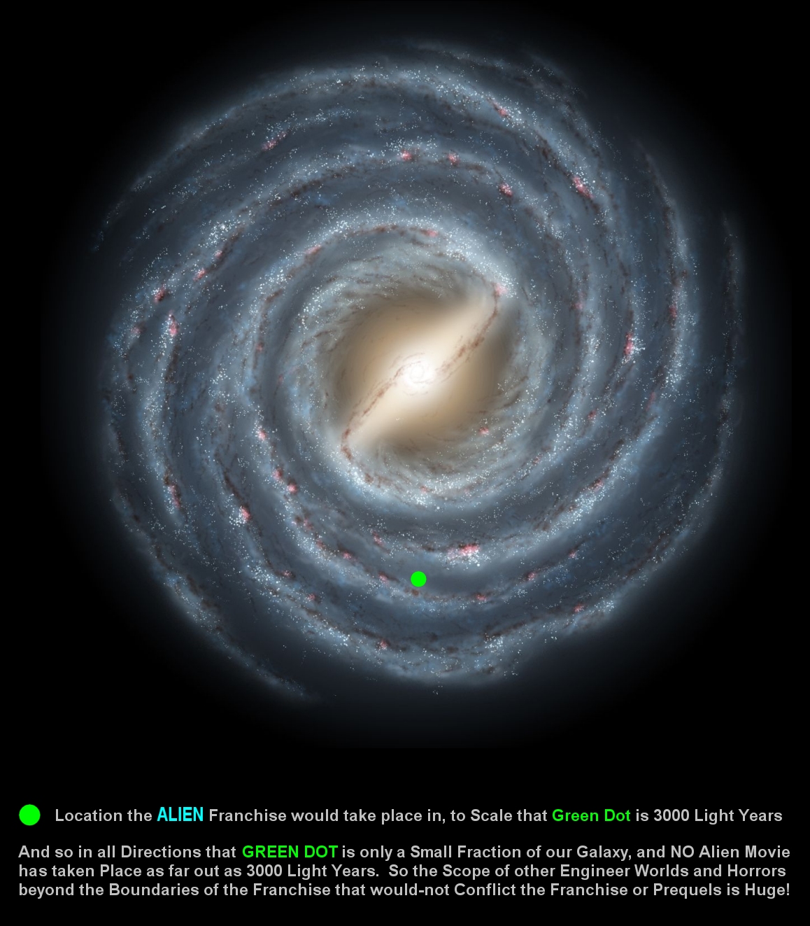 I think we can understand WHY the Prequels had to give our Engineers a Location so Close, which was so that it was within Reach of Humanity within the Time-Line... Having the USCSS Prometheus travel say Thousands of Light Years away would have seemed Silly if we are talking a Prequel in regards to Technology (Speeds and Cryo-sleep). With a Sequel the Likelihood the Engineers would be BASED so Close to us seems a Coincidence, but a Necessary one again so that a Human Expedition could reach there in a Time-Line prior to ALIEN. A Example is the Nostromo would take about 64-65 Years to Travel the Distance of that Green Dot, from SIDE to SIDE.