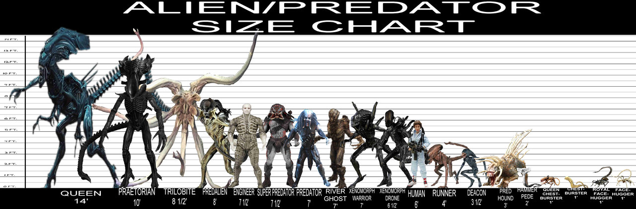 You would imagine the Deacon would have grown significantly larger when fully grown (not taking into account the Fire and Stone comic depiction), to about roughly the size of the AVP:R Pred-alien @10ft if you take the below chart as accurate of the heights between the standard Yautja and the Prometheus Engineer.
