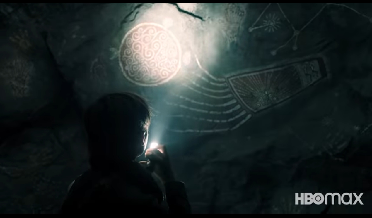 The cave painting seems to symbolize a rocket that left a planet, maybe Earth.