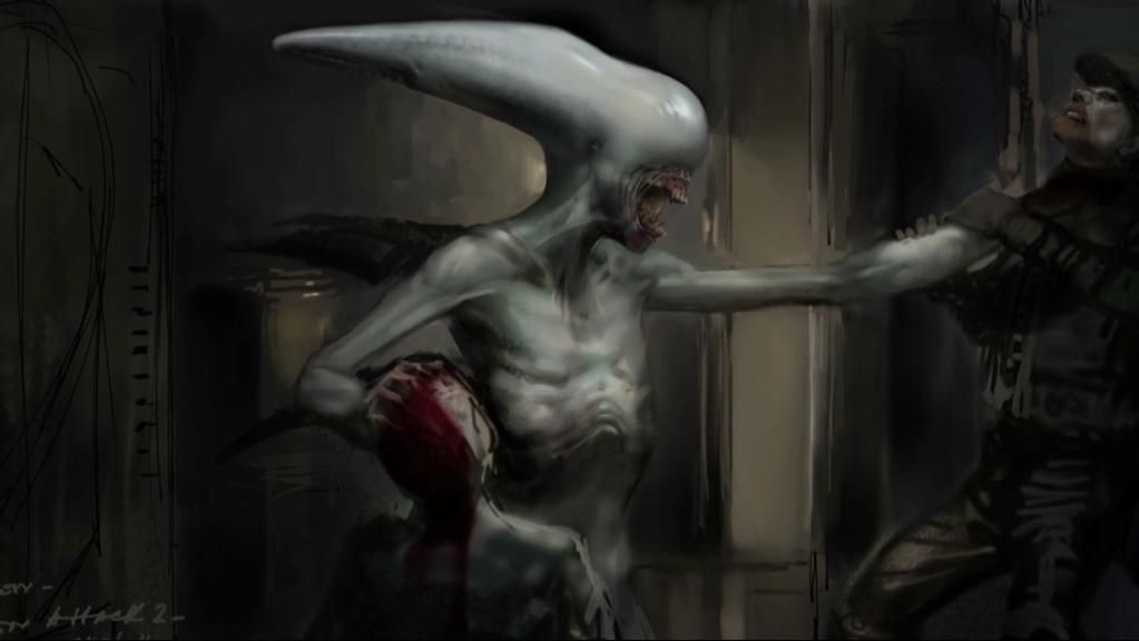 You added some interesting things in your writing. Milburn and the chestbusting, it would be cool if we would have seen something like the tentacles shooting out through the body like the concept art of Holloway I think that it was. Here is the picture that I mentioned: