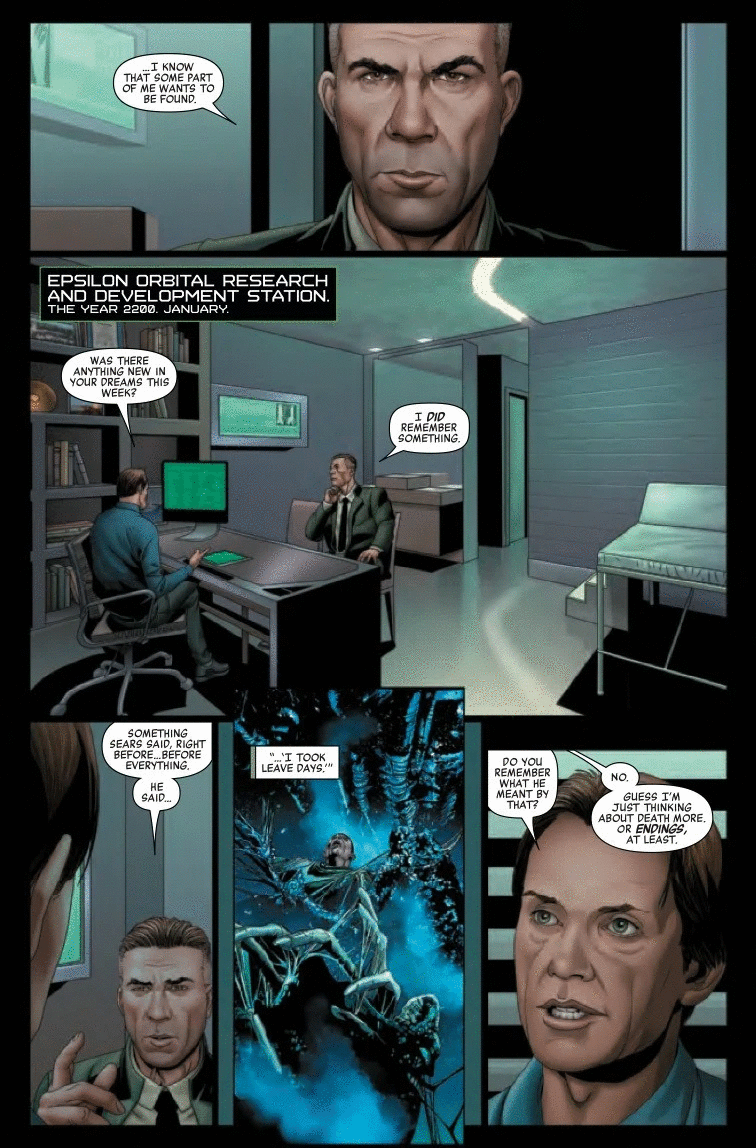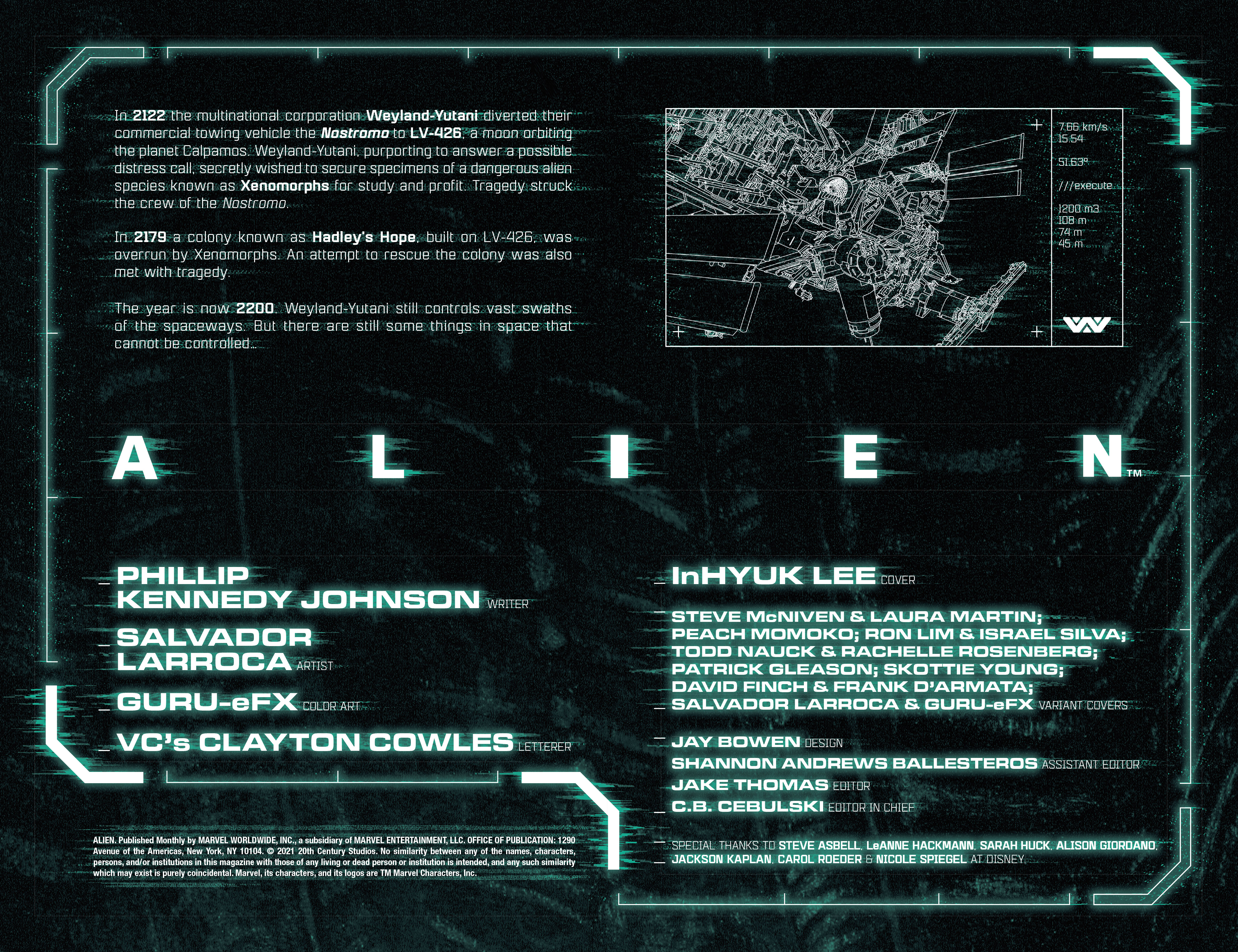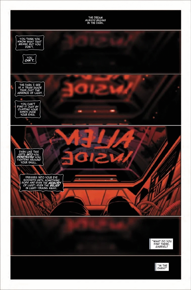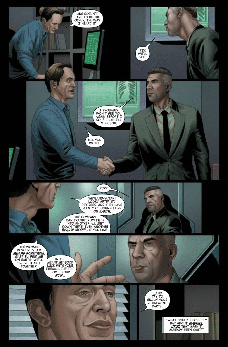 Written by Phillip Kennedy Johnson, with art by Salvador Larroca, colors by GURU-eFX and letters by Clayton Cowles, the issue sees Cruz, Bishop and Danny’s girlfriend Iris try to escape the facility. Bishop approaches Iris, who grabs a gun and opens fire on him. Bishop seems to kill her, shocking Gabriel, as Bishop models are not permitted to kill. It is revealed that Iris is a rogue synth of unknown origin. She says that, thanks to Danny, Earth will become a "post-organic Utopia." Just as Cruz goes to finish her off, she tells him she has information about his visions. He presses her, and she reveals that humans were not the first organics to attempt to leave their solar system; when organics become "arrogant enough" for space-travel, they find "Prometheus' cleansing fire" waiting. Each species tries to first harness the fire, and then use it to augment themselves. Iris tells Gabriel that the Woman in the Dark is the unavoidable result of his species attempting to harness the powers of the Xenomorph.