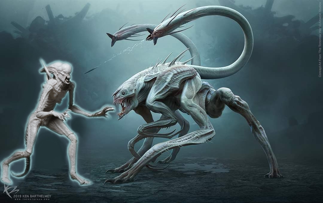 Having just watched Chris McKay's The Tomorrow War, it's very clear this film borrowed heavily from the Alien franchise - specifically Prometheus and Alien: Covenant, which I outlined in a recent article here. The White Spikes as they're called, are the hostile alien species which seemingly "invade" Earth. I'll try to avoid any spoilers in this topic for those who may not have seen The Tomorrow War yet, so I won't go into much detail about their origins and purpose, but I can assure you, the premise has an abundance of Prometheus vibes. One thing I will note, is that I love the design of the White Spikes. Created by concept artist Ken Barthelmey (see more here), these Xenomorph-esque are very comparable to the Aliens seen throughout the Alien movies, Prometheus and Alien: Covenant. Their temperament reminds me a lot of the Neomorphs especially from Covenant.