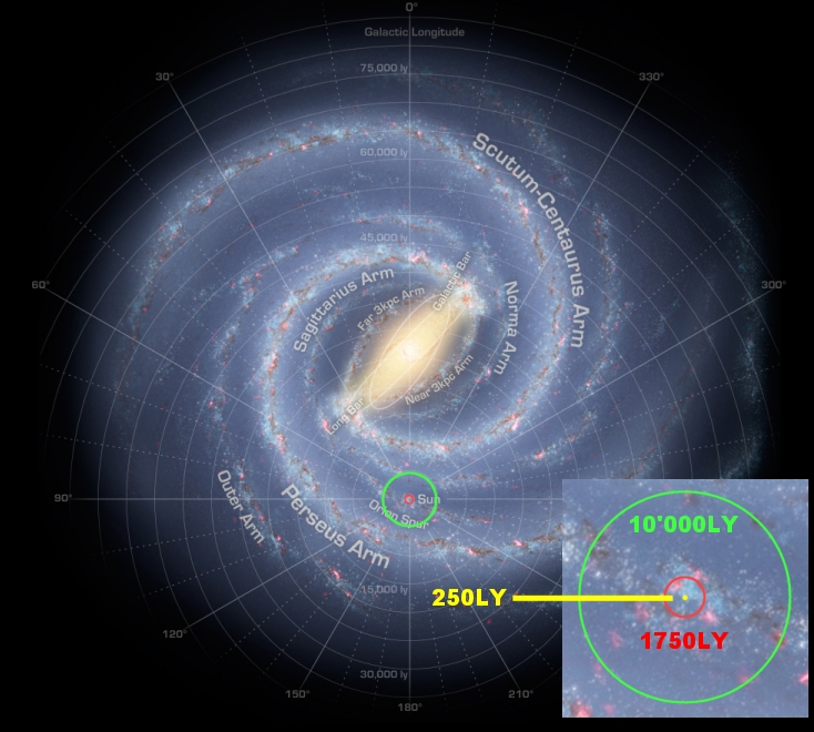 Looking at the MAP ABOVE....... our SUN/SOLAR SYSTEM is Located within the YELLOW DOT, the Diameter of this DOT is 250LY and so the ALIEN FRANCHISE has taken Place so FAR in LESS than a 5th of this YELLOW DOT.