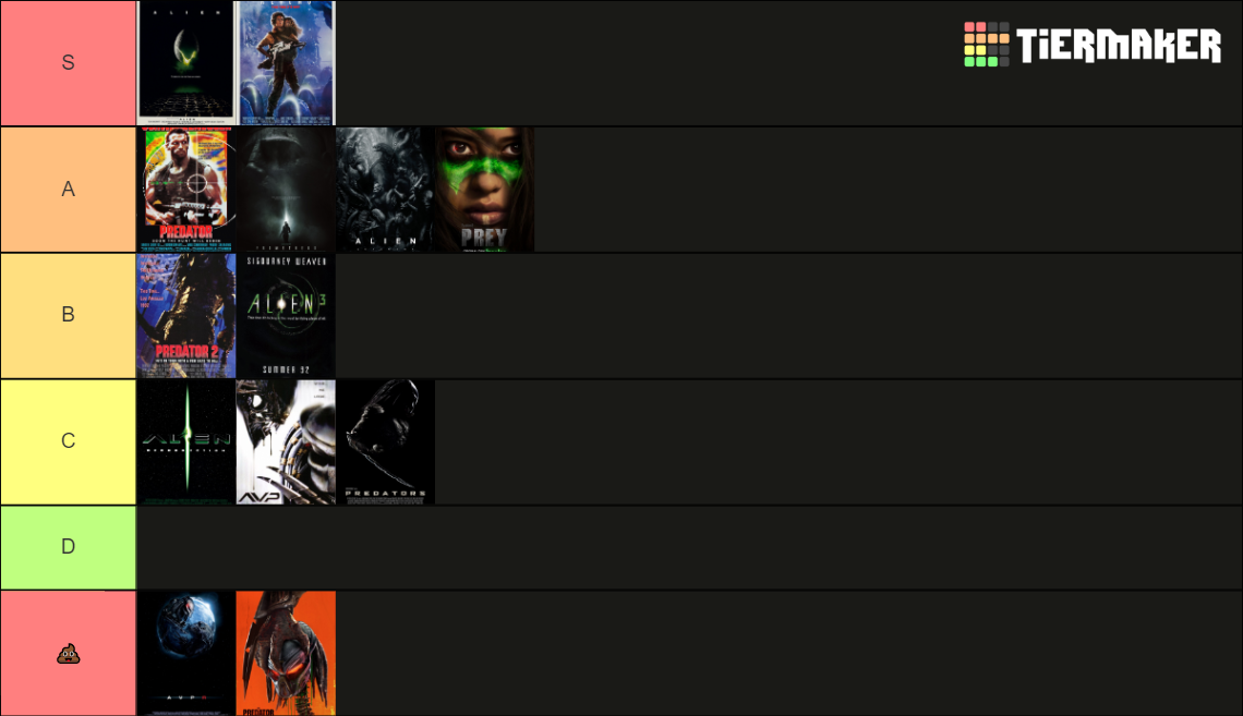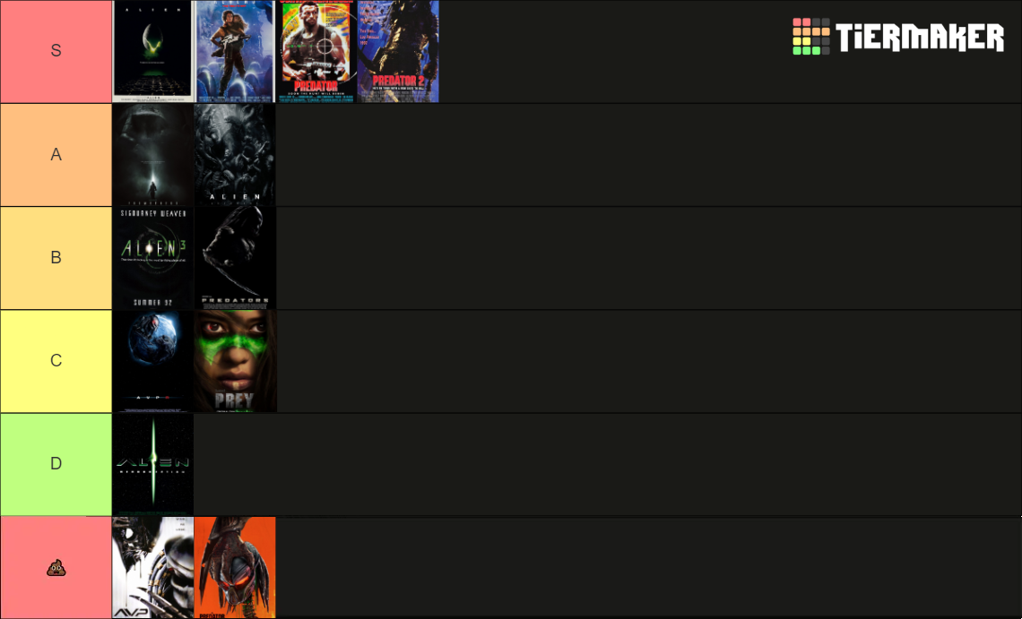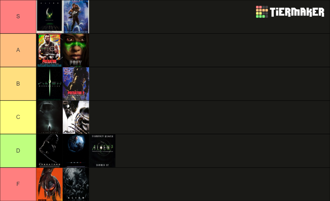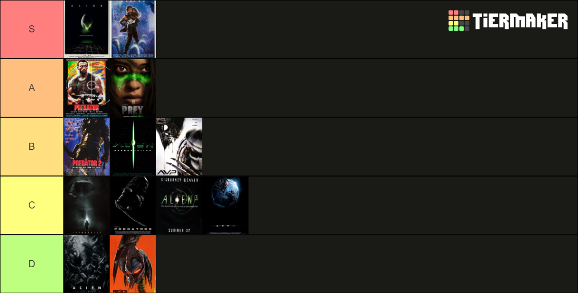 I also have a big soft spot for Resurrection. not a good movie, but so many great actors clearly having a great time and the alien newborn is one of my favorite designs. too bad it wasnt in a better movie. I really want to put Prometheus Higher because it had so many great ideas. if they released a cut of the movie with some of the deleted scenes included or someone made a fan edit I would definitely put it in B or maybe even A, but as it stands it just has a lot of issues that hold it back. I dont have much to say about predator 2 other than it is kind of just a fun time but isn't nearly as memorable or well made enough to go higher than B for me. Prey was suprisingly great but some of the dialogue, not fully polished CGI at times, and a couple scenerios I think felt forced keep it from being S tier. I think it was really close to being the best predator movie but unfortunately definitely falls a bit behind the original. I think the rest speak for themselves.