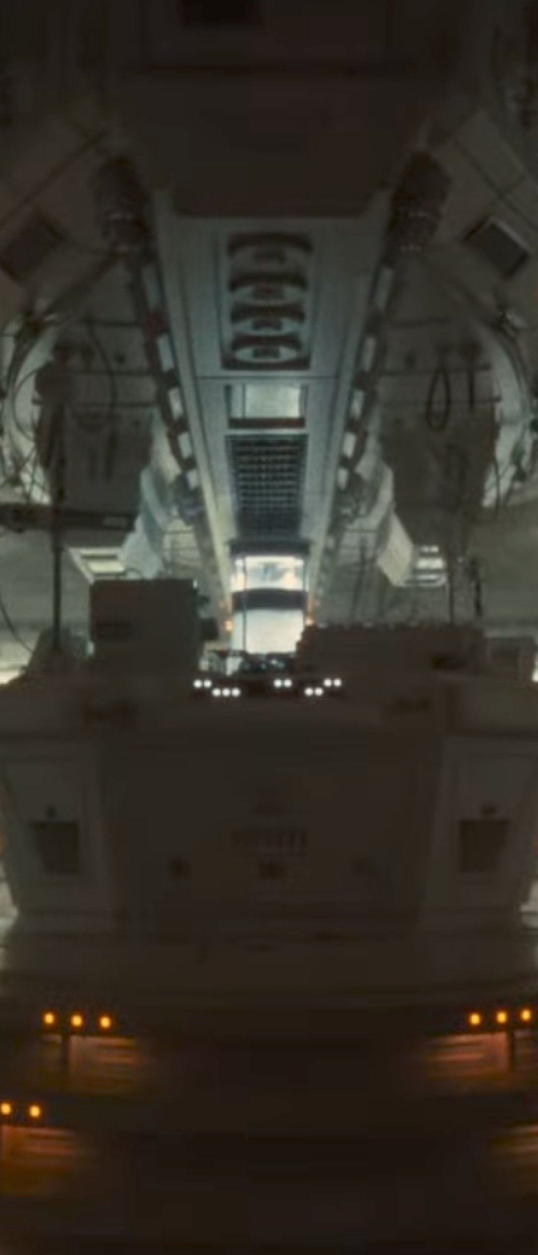 From the perspective inside a cargo hold of a ship (direction facing forward) cargo doors slowly open to reveal the silhouette of two figures in hazmat suits and the alien body from a distance as it draws near the ship's interior. The Alien title is almost complete.