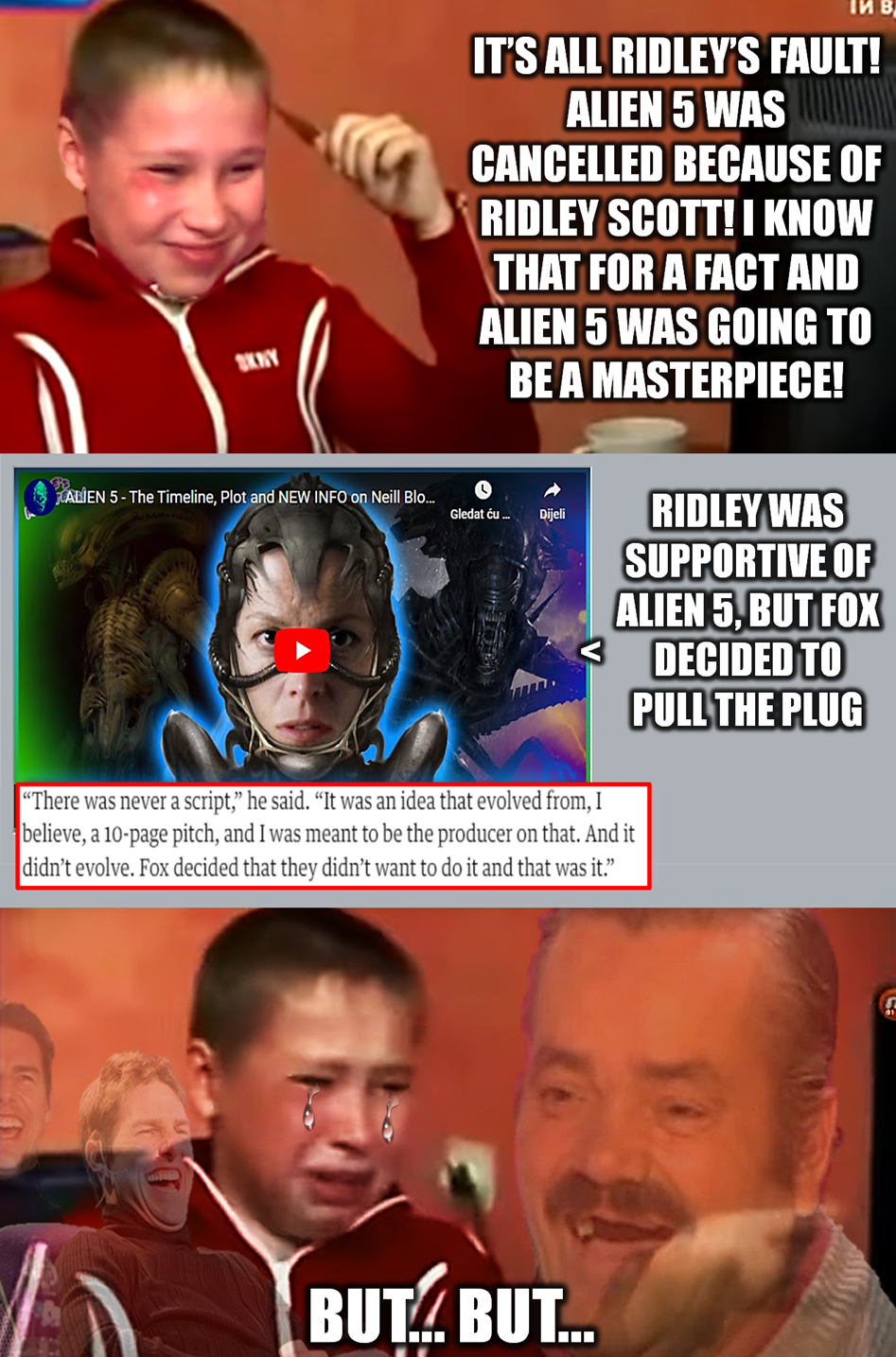 Towards the end of the video (at 37:17), Mike said he was told some plot details about Blomkamp’s alien film by the former executives, folks who worked on the special effects. While he wasn’t able to share everything about the plot yet in case it may get reused in future projects, he did share this plot detail: